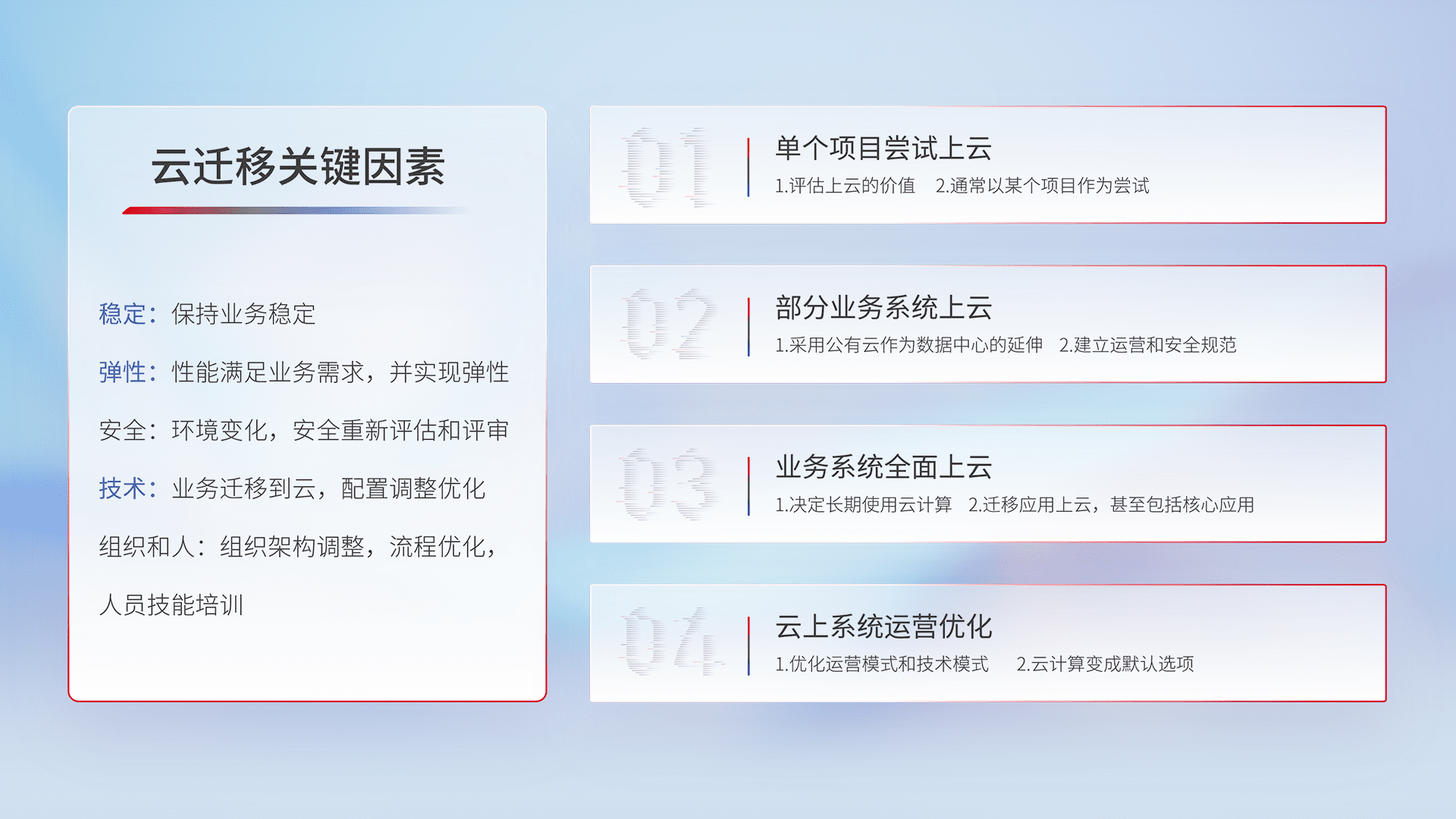 结合实际业务,,从规划设计、、云平台选型、、、云原生改造、、数据迁移、、、、集成交付,,迁移全过程为客户识别最佳上云路径,,,,做好风险识别管理,,,,设计网络架构、、身份权限、、、安全审计合规、、、、操作审计、、、日志审计、、、、监控告警策略、、多站点容灾设计等,,对云上基础设施进行整体规划,,提升IT治理水平,,以满足弹性、、高可用、、、、高性能的需求。。
