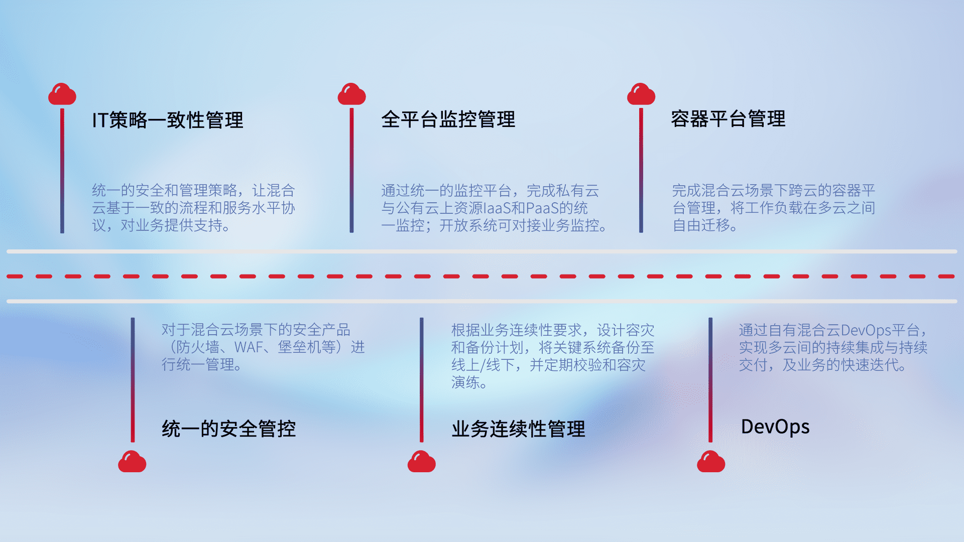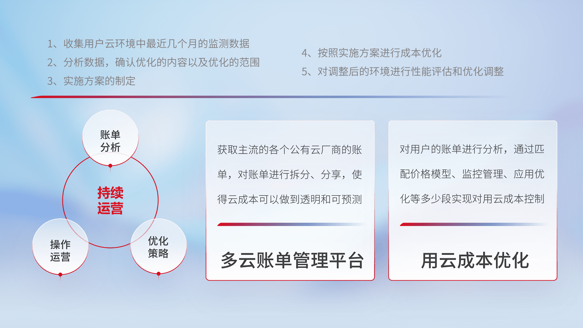 通过多云纳管,,,以统一的资源数据模型把客户的云资源进行抽象和封装,,,进而实现对多云资源的统一操作,,保障云资源管理的可靠性、、、、稳定性与可用性。。。量身定制化运维内容,,,配置、、开发运维、、补丁管理、、、、备份、、、监控、、、、认证和访问管理、、审计和日常巡检等,,保障在用云过程中的可靠度,,稳定度以及高可用率。。
