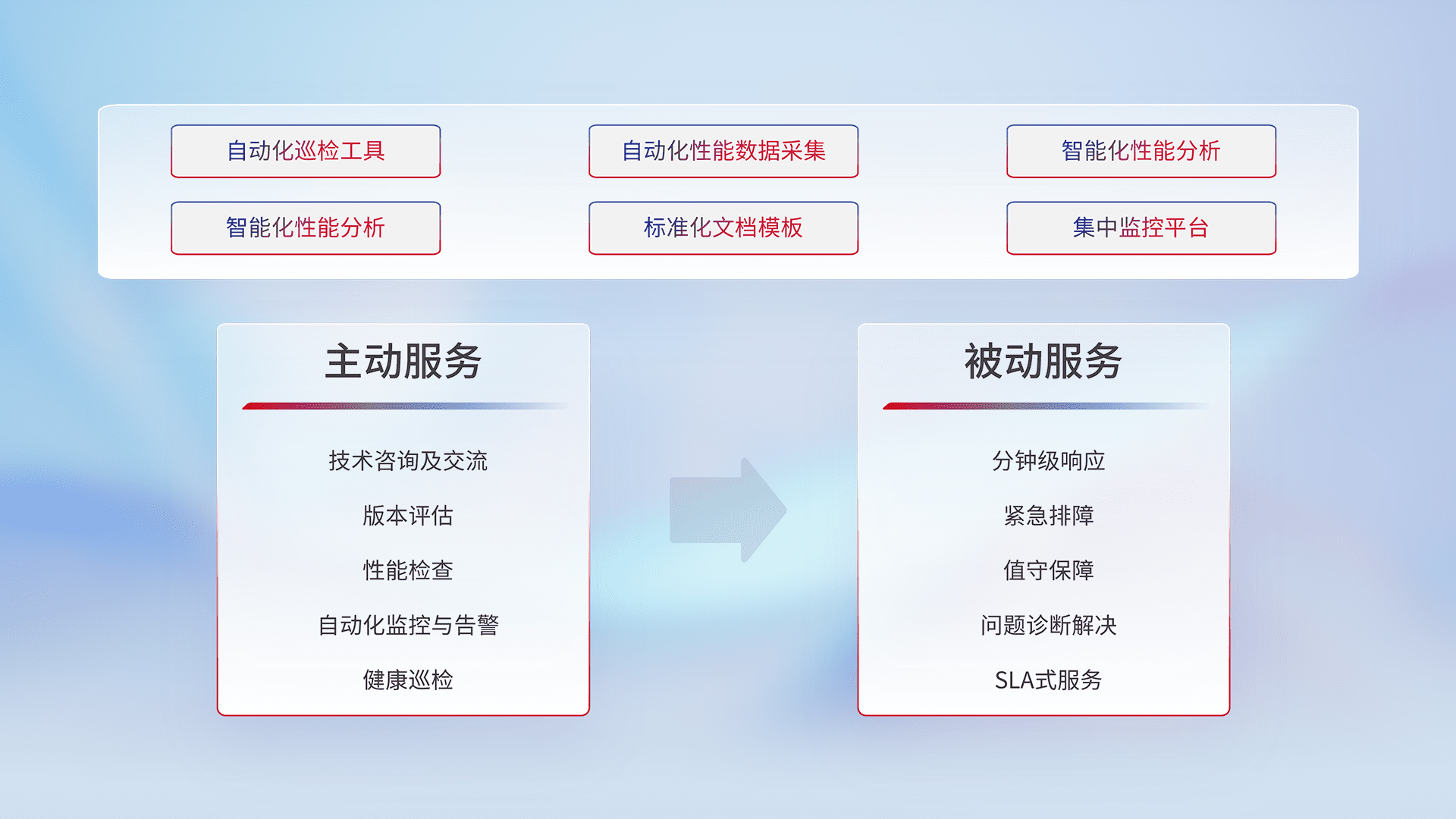 智能化工具和标准化文档,,,保障服务质量,,提供主动服务(包含技术咨询、、、、版本评估、、、、性能检查、、、、自动化监控与告警、、、健康巡检)和被动服务包含(分钟级响应、、、紧急排障、、、、值守保障、、、问题诊断解决、、、SLA服务)。。。